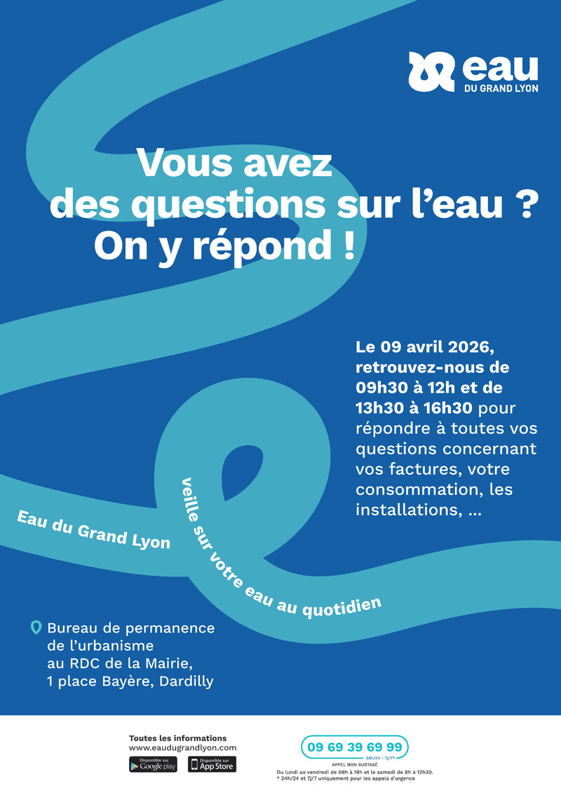 Jeudi 9 avril 2026, retrouvez les équipes du service Eau du Grand Lyon de 9h30 à 12h et de 13h30 à 16h30 pour répondre à toutes vos questions concernant vos factures d'eau, votre consommation quotidienne, les installations...